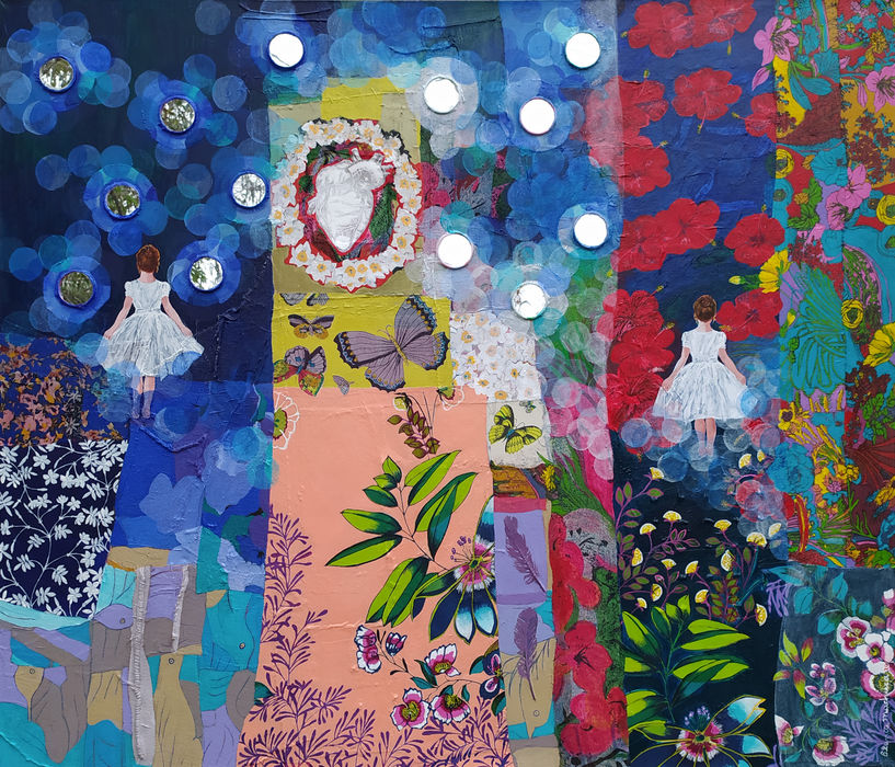 BLANCA MACHUCA elogio al jardin - 2021 Puedo imaginarla sentada en la quietud del taller. Puedo imaginarla parada en el pasto, detenida en la contemplación de cielos cambiantes o en el ritmo lento del crecimiento de las plantas. En el jardín el tiempo es más lento, no hay prisa…dice Blanca Machuca y puedo imaginarlo. Con la misma coherencia de sus trabajos anteriores las obras actuales recuperan los temas que siempre le interesaron: la mujer (las mujeres), la tierra, la memoria o la recuperación de tradiciones regionales. Pero todo aparece hoy como rodeado por el silencio de un tiempo suspendido. Un tiempo que agudizó la percepción e impuso su no-tiempo. Las pinturas de Machuca evocan su tránsito por el jardín, la contemplación detenida de un trozo de cielo interceptado por una flor o una rama, un cielo caído sobre la hierba, los pies anclados (enraizados) en la tierra. Una tela prístina, recupera, quizás con la misma parsimonia, el deambular lánguido de las fases lunares y los bordados atrapan secretos cristales, talismán necesario más que nunca. La artista despliega así un entramado amoroso de contención construido con trazos, incrustaciones, hilos. Puedo imaginarla abrazada por la calma del jardín, sanándonos. Puedo imaginarnos, extasiados, frente a sus entrañables objetos artísticos. María Teresa Constantin Miembro de la Asociación Argentina de Críticos de Arte